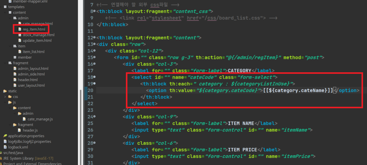 form태그로 th:action을 주어 경로를 admin 컨트롤러에 있는 regItem에 넣어주고, method를 post로 한다.
