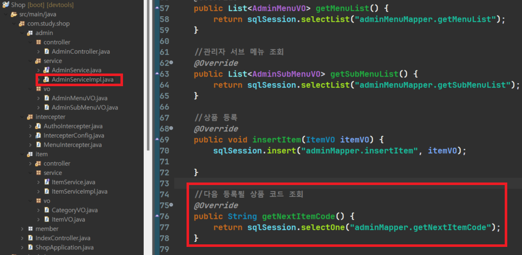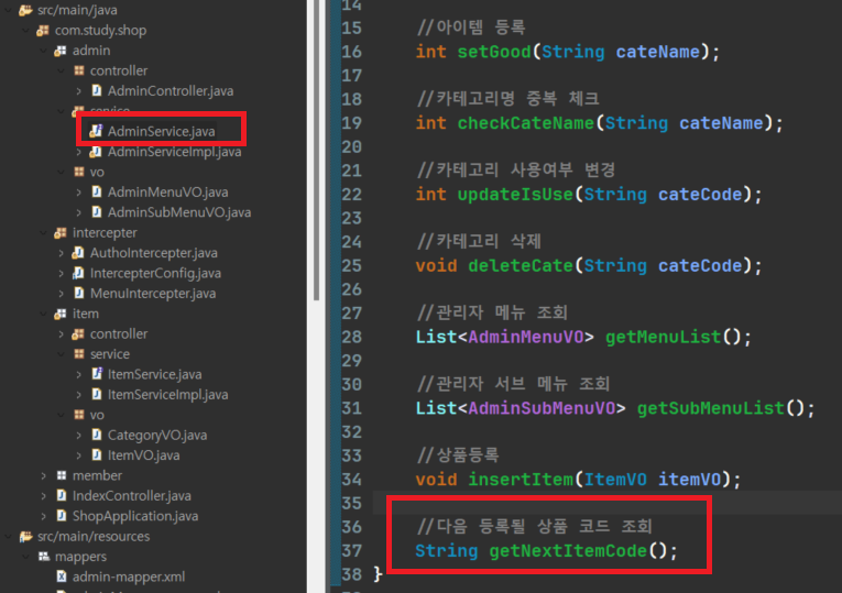 admin-mapper에서 resultType을 String으로 주면서 데이터베이스에 저장 될 ITEM_CODE의 형식을 지정해준다.