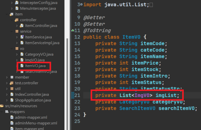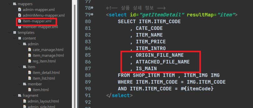 쿼리에 IS_MAIN을 추가해주었고, 쿼리문의 빨간 박스는 ItemVO에 있는 imgList안에 있는 VO이다.