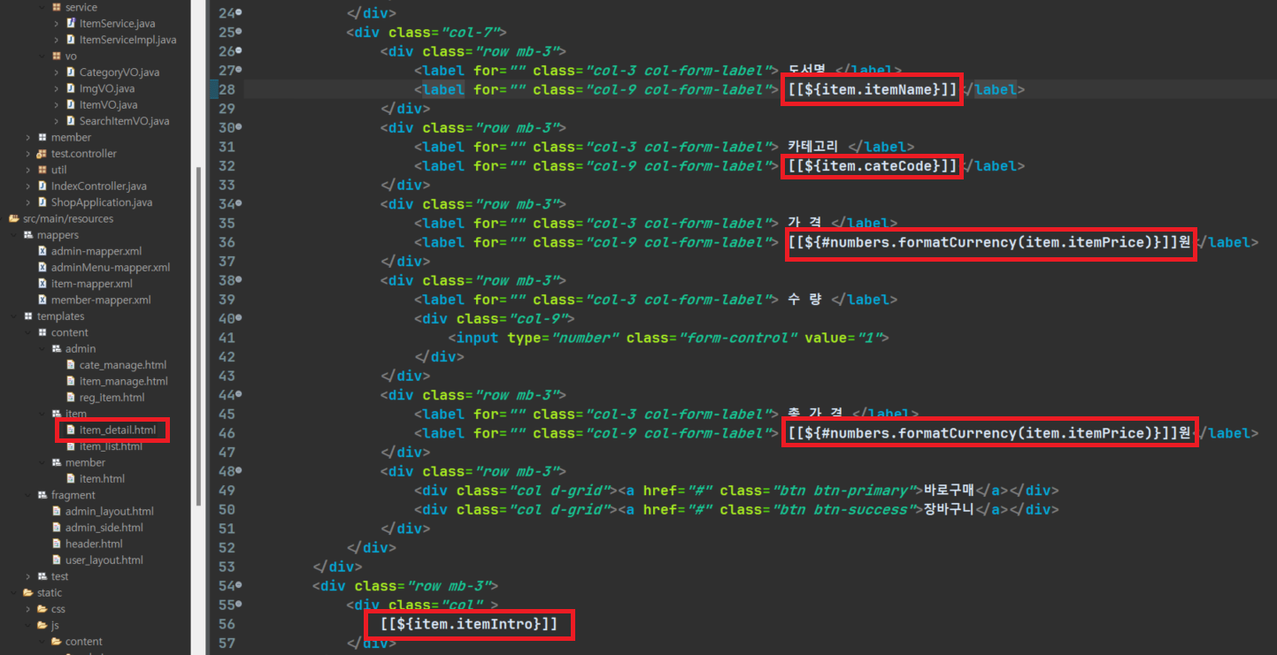 item 이라는 이름으로 itemVO 객체를 넘겼기 때문에, 내용은 여기서 detail.html에서 이렇게 뽑아쓰면 된다.
