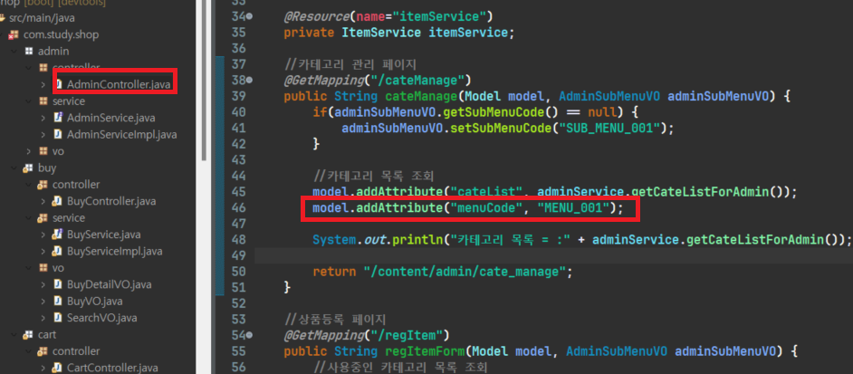 model에 menuCoed이름으로 MENU_002, MENU_003을 각각 가져간다.