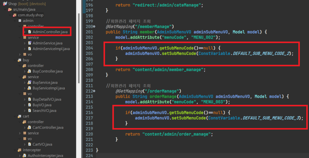 컨트롤러의 상세 주소는 데이터베이스에 SUB_MENU_URL로 만들어주었기 때문에, 데이터 값을 끌어 와주면 된다.