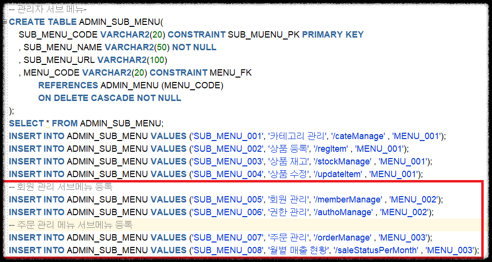 여기까지가 메인메뉴에 상품관리가 선택되면 서브메뉴로 카테고리관리, 상품등록, 상품관리가 조회되는 것이다.