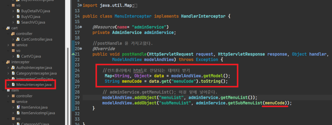 MenuInterceptor의 modelAndView에 메인메뉴리스트 조회와 서브메뉴리스트 조회 두 쿼리문이 담겨져있다.