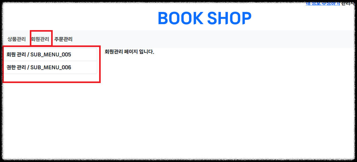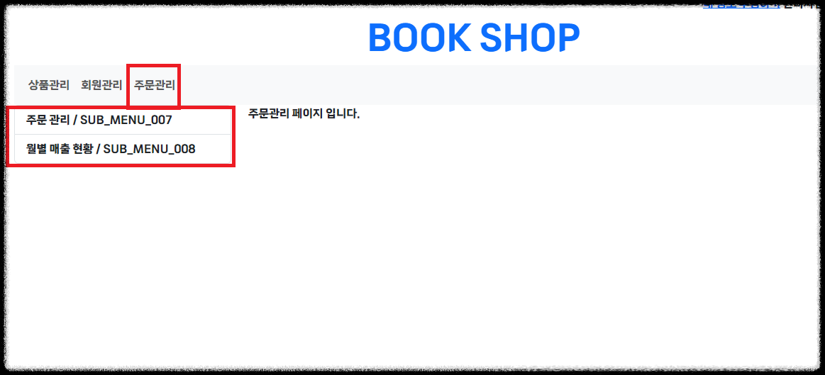 이렇게 DB에 저장된 MENU_002와 MENU_003 데이터 들이 각각 회원관리, 주문관리에 들어가 서브메뉴로 나타나 있는 것을 확인할 수 있다.