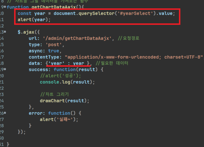 ajax에서 year 데이터가 제대로 바뀌지 않다는 것도 알 수 있다. 왜 문제가 있냐면,