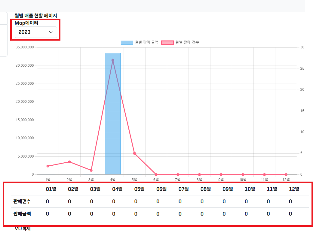 판매 건수와, 판매금액 데이터에는 0으로 데이터가 잘 들어와있다. 하지만, 차트가 바뀌지 않았다.