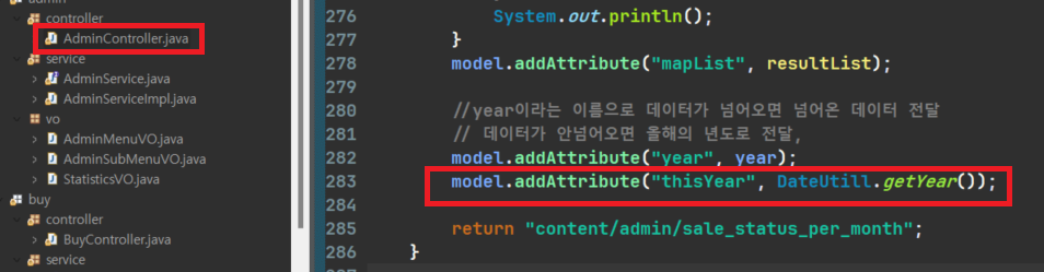 컨트롤러에 model 객체에 year 이름으로 추출될 수 있도록 DateUtil에서 만든 getYear메소드를 넣어주었따.