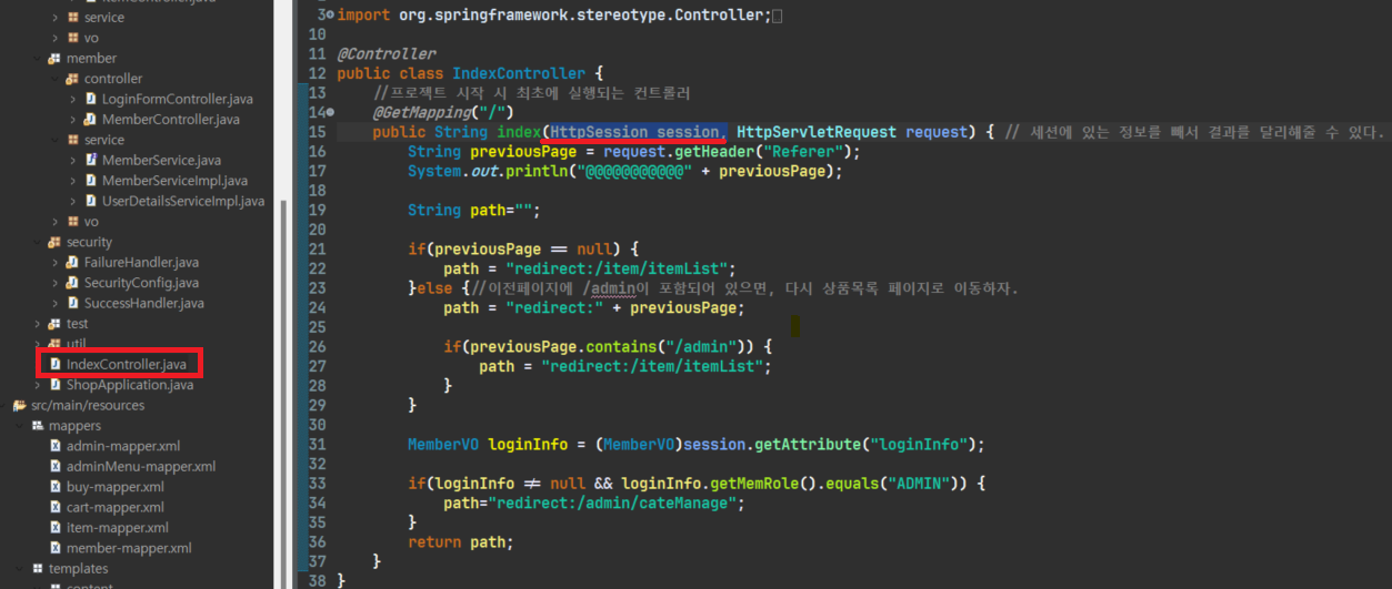 로그인한 사람의 권한 정보를 담은 List를 생성 후 변수를 담아준다.