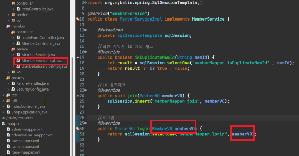 마찬가지로 MemberServiceImpl에서도 memId 하나만 매개변수로 설정해준다.
