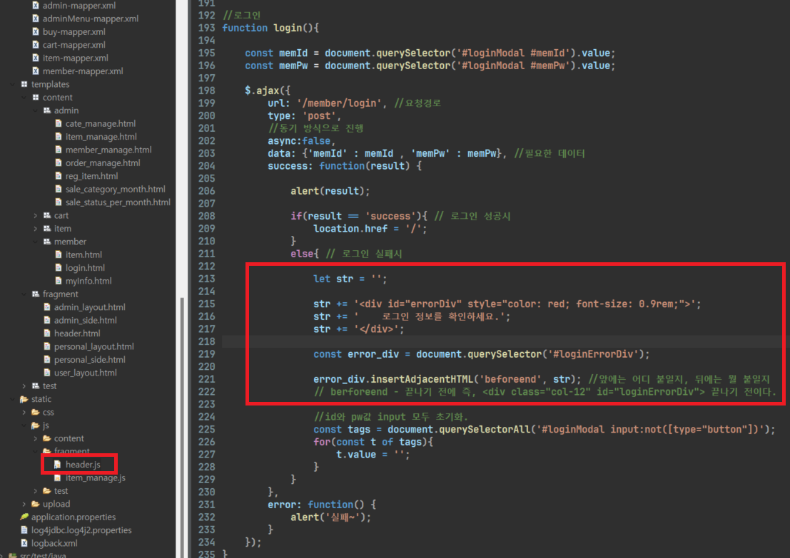 header.html에서 loginErrorDiv id를 생성해주었다. js에서 어떤 기능을 통해 추가하기 위함이다.