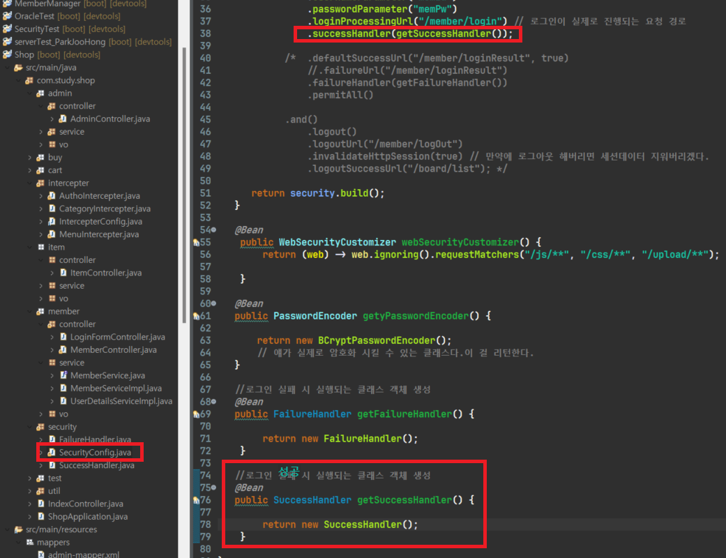 로그인 실패시 확인하기 위해 위 코드를 삭제한 후, SuccessHandler에서 사용했던걸 가져와줬다.