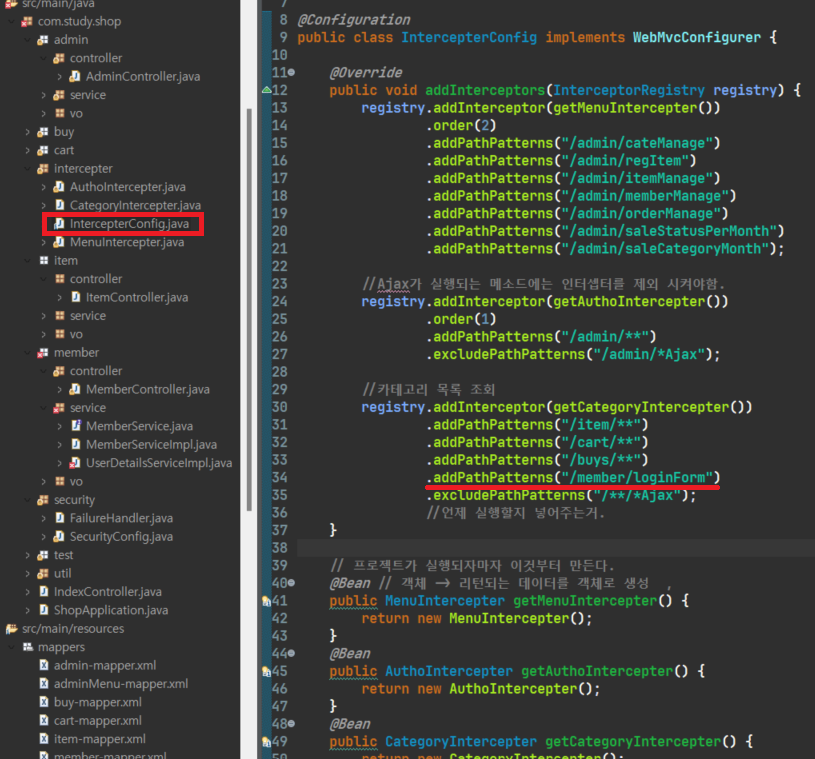 interceptor에서 member/loginForm에도 이렇게 추가해주면, 위 카테고리 데이터도 가지고와서 뜰 수 있게 해준다.