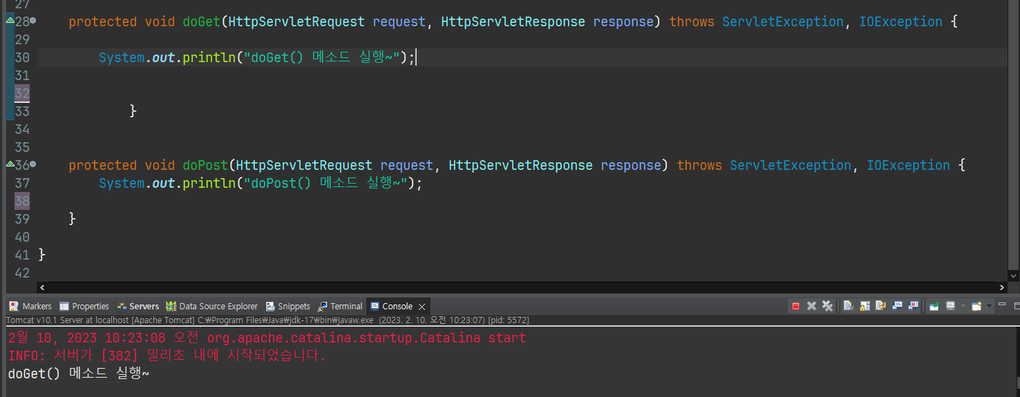 위 코드를 실행했을 땐 doGet( ) 메소드가 실행되어 콘솔창에 출력되었다.