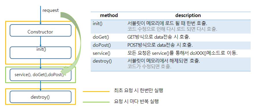 main 메소드가 실행되면 doGet( ) 메소드나 doPost( ) 메소드 중 하나가 무조건 실행 된다.