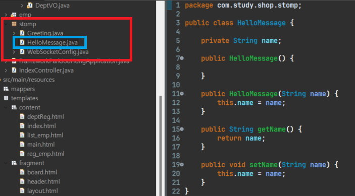 1 2 3 4 5 6 7 8 9 10 11 12 13 14 15 16 17 18 19 20 21 22 | package com.study.shop.stomp; public class HelloMessage { private String name; public HelloMessage() { } public HelloMessage(String name) { this.name = name; } public String getName() { return name; } public void setName(String name) { this.name = name; } } | cs |