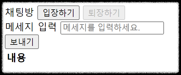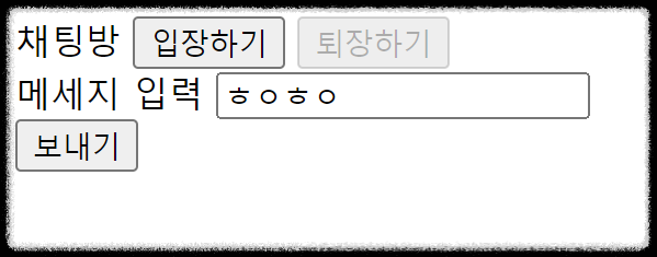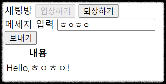 입장하기를 누르고, 메시지 입력에 텍스트를 입력후 보내기를 누르면 아래와 같이 실시간 채팅이 활성화된다.