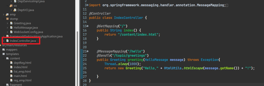 5. 소켓 통신을 받을 SenTo와 MessageMapping을 컨트롤러에서 해주면 js에서 통신이된다.