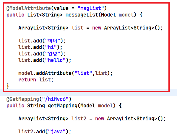 hiMvc6을 보면, 왼쪽 사진의 messageList 메소드에 있는 Model 값도 나타난 것을 확인할 수 있다.