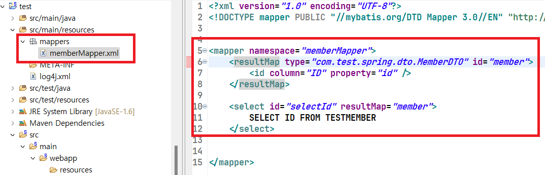 1 2 3 4 5 6 7 8 9 10 11 12 13 14 | <?xml version="1.0" encoding="UTF-8"?> <!DOCTYPE mapper PUBLIC "//mybatis.org/DTD Mapper 3.0//EN" "http://mybatis.org/dtd/mybatis-3-mapper.dtd" > <mapper namespace="memberMapper"> <resultMap type="com.bit.spring.dto.MemberDTO" id="member"> <id column="ID" property="id" /> </resultMap> <select id="selectId" resultMap="member"> SELECT ID FROM TESTMEMBER </select> </mapper> | cs |