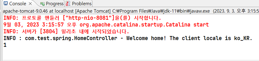 이렇게 페이지가 정상작동하며, 콘솔창에 1이 뜨는것을 확인해볼 수 있다. 이렇게하면 mybatis 연동 잘 된것이다.