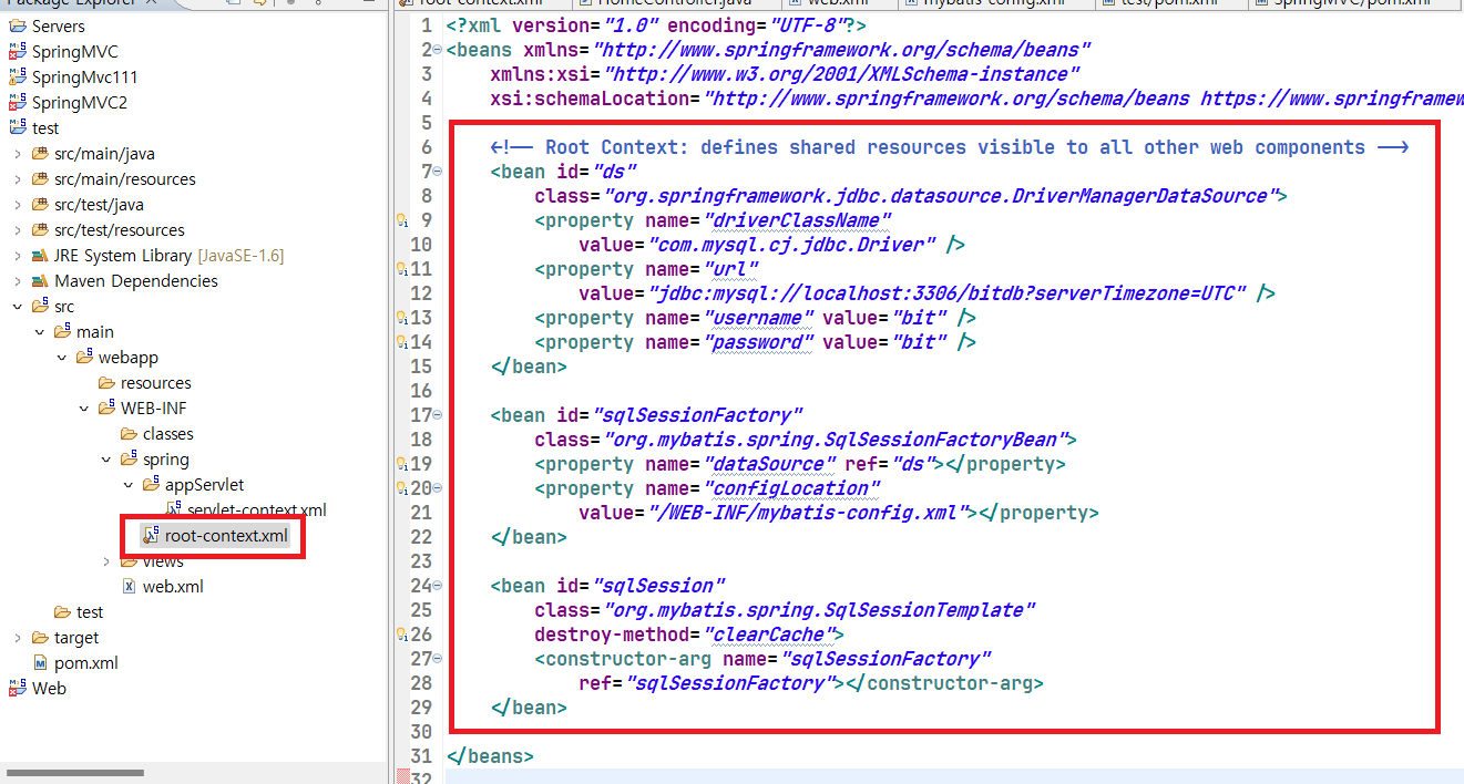 1 2 3 4 5 6 7 8 9 10 11 12 13 14 15 16 17 18 19 20 21 22 23 24 25 | <!-- Root Context: defines shared resources visible to all other web components --> <bean id="ds" class="org.springframework.jdbc.datasource.DriverManagerDataSource"> <property name="driverClassName" value="com.mysql.cj.jdbc.Driver" /> <property name="url" value="jdbc:mysql://localhost:3306/bitdb?serverTimezone=UTC" /> <property name="username" value="bit" /> <property name="password" value="bit" /> </bean> <bean id="sqlSessionFactory" class="org.mybatis.spring.SqlSessionFactoryBean"> <property name="dataSource" ref="ds"></property> <property name="configLocation" value="/WEB-INF/mybatis-config.xml"></property> </bean> <bean id="sqlSession" class="org.mybatis.spring.SqlSessionTemplate" destroy-method="clearCache"> <constructor-arg name="sqlSessionFactory" ref="sqlSessionFactory"></constructor-arg> </bean> | cs |