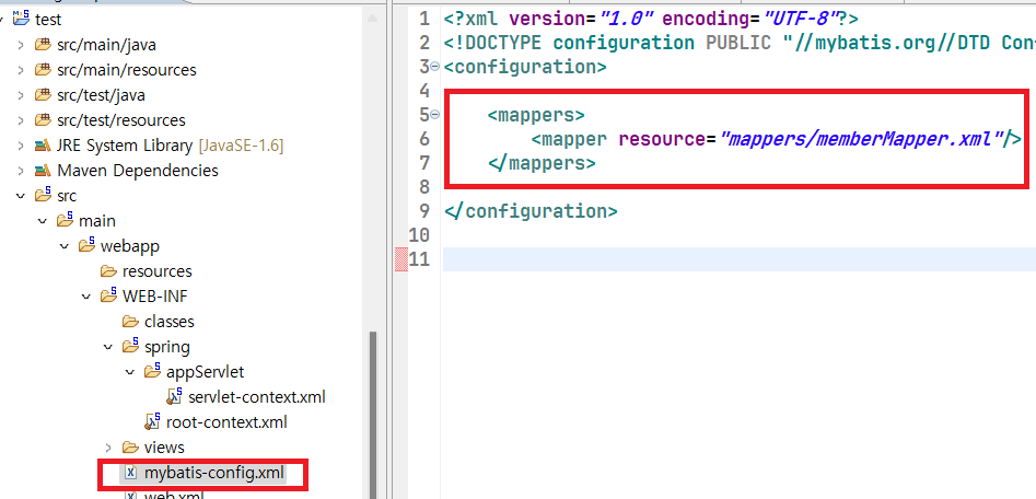 1 2 3 4 5 6 7 8 9 10 11 | <?xml version="1.0" encoding="UTF-8"?> <!DOCTYPE configuration PUBLIC "//mybatis.org//DTD Config 3.0//EN" "http://mybatis.org/dtd/mybatis-3-config.dtd" > <configuration> <mappers> <mapper resource="mappers/memberMapper.xml"/> </mappers> </configuration> | cs |