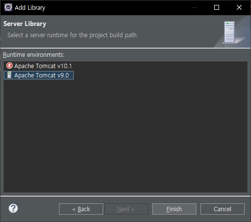 이전 파일은 삭제되어 X표시가 뜨는데, 새로 설치한 9.0버전으로 선택 후 Finish를 눌러준다.