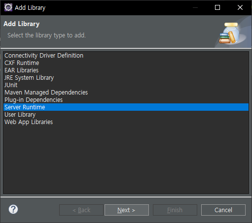Classpath을 클릭한 후 Add Libray 파일로 들어간다. Server Runtime을 선택후 Next를 눌러준다.