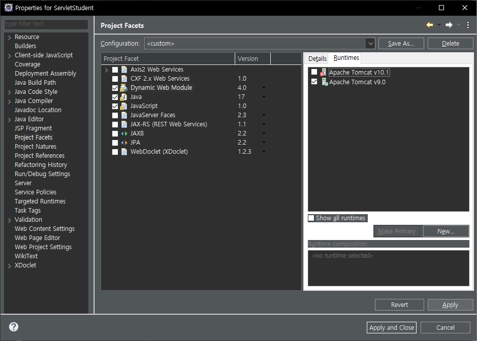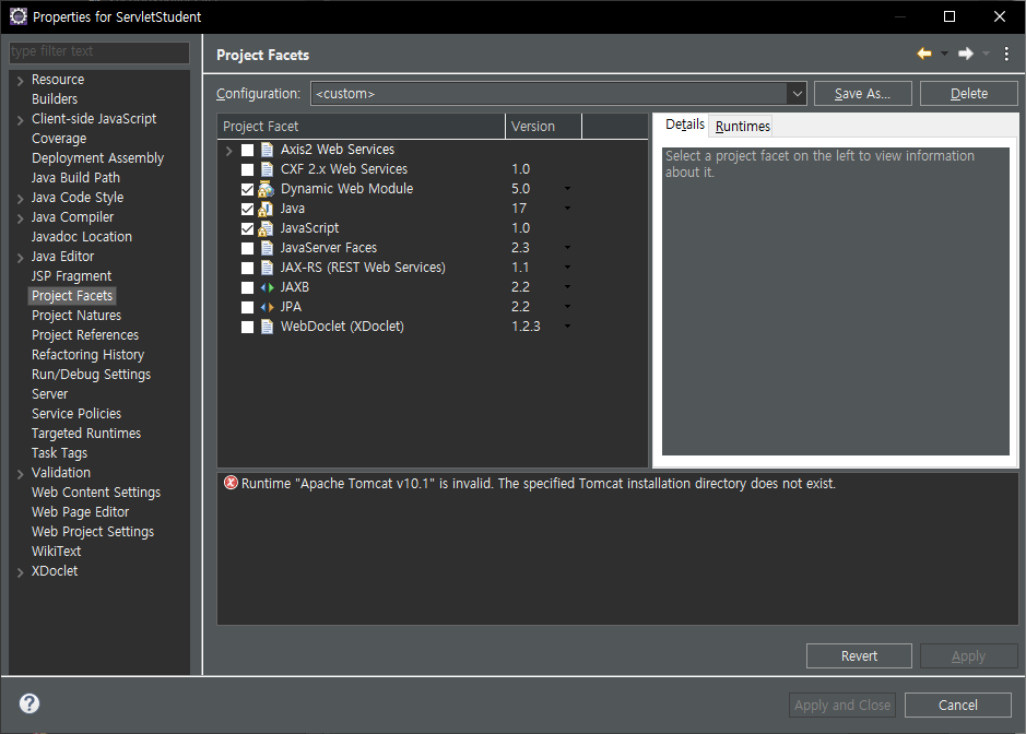 왼쪽열에 있는 Project Facets를 선택하여 오른쪽 그림과 같은 화면으로 이동한다.