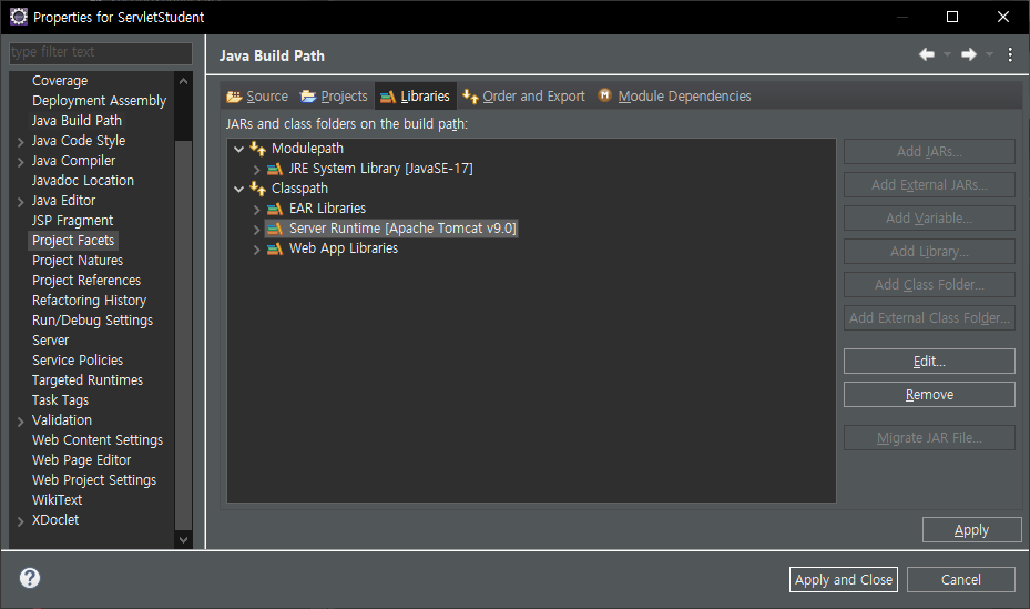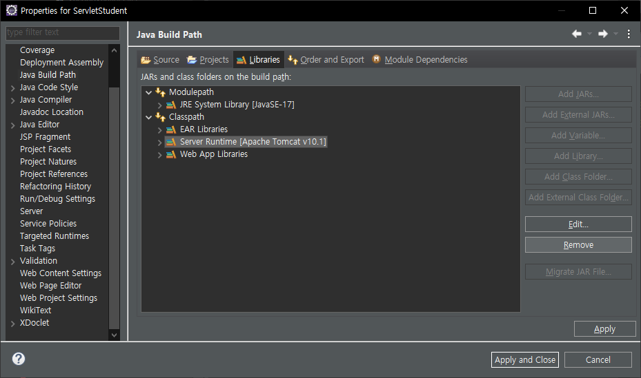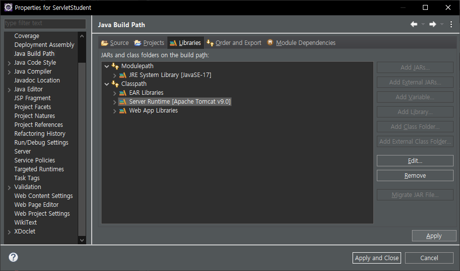 라이브러리에 있는 톰캣 이전버전을 Remove 시킨다.