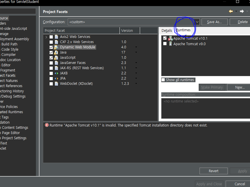 이후 오른쪽에 Runtimes를 눌러주면 톰캣 9.0이 생긴걸 볼 수 있다.