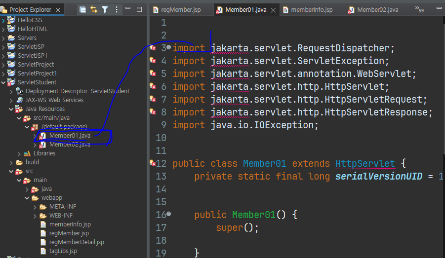 이후 저장하면 Member01 서블릿에는 오류가 없는 걸 확인할 수 있다.