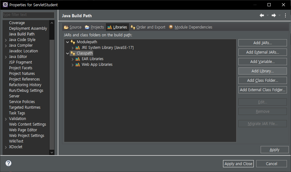 해당 프로젝트 우클릭을하여 Build Path의 Configure Build Path에 들어간다.