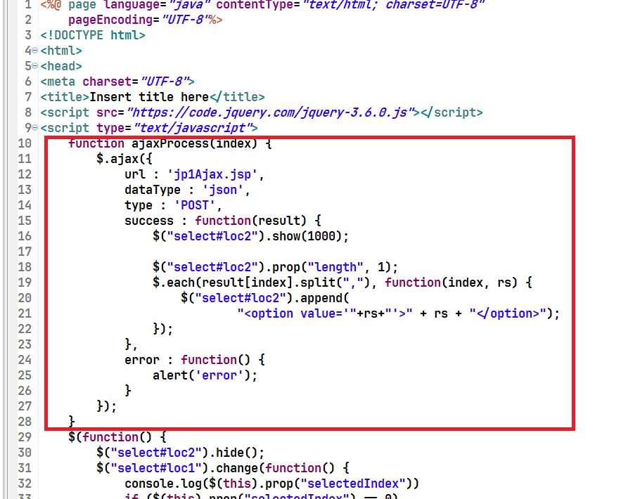 .change(function() { ... }): 이 코드는 "loc1" <select> 요소의 변경 이벤트에 대한 핸들러 함수를 등록한다.