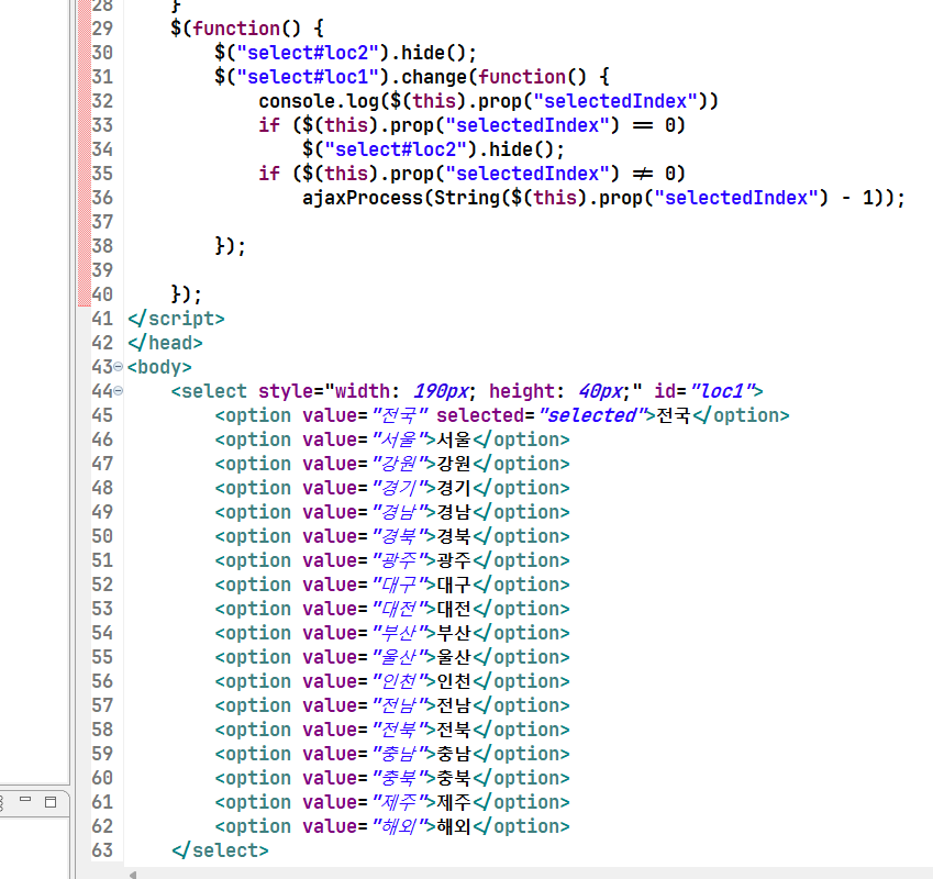 $("select#loc2"): 이 부분은 ID가 "loc2"인 <select> 요소를 선택하는 jQuery 선택자이다