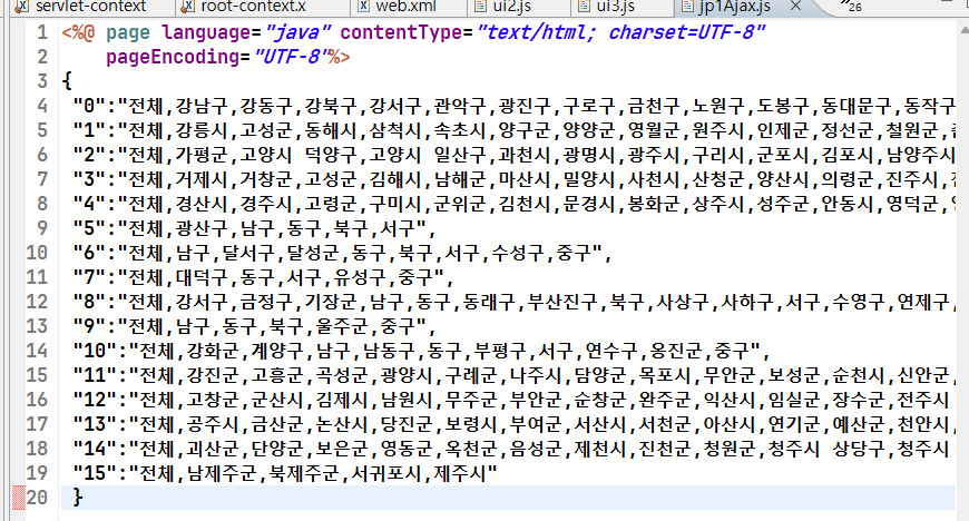 1 2 3 4 5 6 7 8 9 10 11 12 13 14 15 16 17 18 | { "0":"전체,강남구,강동구,강북구,강서구,관악구,광진구,구로구,금천구,노원구,도봉구,동대문구,동작구,마포구,서대문구,서초구,성동구,성북구,송파구,양천구,영등포구,용산구,은평구,종로구,중구,중랑구", "1":"전체,강릉시,고성군,동해시,삼척시,속초시,양구군,양양군,영월군,원주시,인제군,정선군,철원군,춘천시,태백시,평창군,홍천군,화천군,횡성군", "2":"전체,가평군,고양시 덕양구,고양시 일산구,과천시,광명시,광주시,구리시,군포시,김포시,남양주시,동두천시,부천시 소사구,부천시 오정구,부천시 원미구,성남시 분당구,성남시 수정구,성남시 중원구,수원시 권선구,수원시 장안구,수원시 팔달구,수원시 영통구,시흥시,안산시,안성시,안양시 동안구,안양시 만안구,양주시,양평군,여주군,연천군,오산시,용인시,의왕시,의정부시,이천시,파주시,평택시,포천시,하남시,화성시", "3":"전체,거제시,거창군,고성군,김해시,남해군,마산시,밀양시,사천시,산청군,양산시,의령군,진주시,진해시,창녕군,창원시,통영시,하동군,함안군,함양군,합천군", "4":"전체,경산시,경주시,고령군,구미시,군위군,김천시,문경시,봉화군,상주시,성주군,안동시,영덕군,영양군,영주시,영천시,예천군,울릉군,울진군,의성군,청도군,청송군,칠곡군,포항시 남구,포항시 북구", "5":"전체,광산구,남구,동구,북구,서구", "6":"전체,남구,달서구,달성군,동구,북구,서구,수성구,중구", "7":"전체,대덕구,동구,서구,유성구,중구", "8":"전체,강서구,금정구,기장군,남구,동구,동래구,부산진구,북구,사상구,사하구,서구,수영구,연제구,영도구,중구,해운대구", "9":"전체,남구,동구,북구,울주군,중구", "10":"전체,강화군,계양구,남구,남동구,동구,부평구,서구,연수구,옹진군,중구", "11":"전체,강진군,고흥군,곡성군,광양시,구례군,나주시,담양군,목포시,무안군,보성군,순천시,신안군,여수시,영광군,영암군,완도군,장성군,장흥군,진도군,함평군,해남군,화순군", "12":"전체,고창군,군산시,김제시,남원시,무주군,부안군,순창군,완주군,익산시,임실군,장수군,전주시 덕진구,전주시 완산구,정읍시,진안군", "13":"전체,공주시,금산군,논산시,당진군,보령시,부여군,서산시,서천군,아산시,연기군,예산군,천안시,청양군,태안군,홍성군,계룡시", "14":"전체,괴산군,단양군,보은군,영동군,옥천군,음성군,제천시,진천군,청원군,청주시 상당구,청주시 흥덕구,충주시", "15":"전체,남제주군,북제주군,서귀포시,제주시" } | cs |
