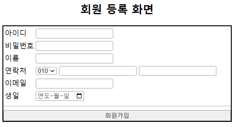 form 태그를 사용 했으므로 "회원가입" 버튼을 누르면 regMember로 가도록 하게 지정해주는 input type을 submit 으로 꼭 지정해준다.