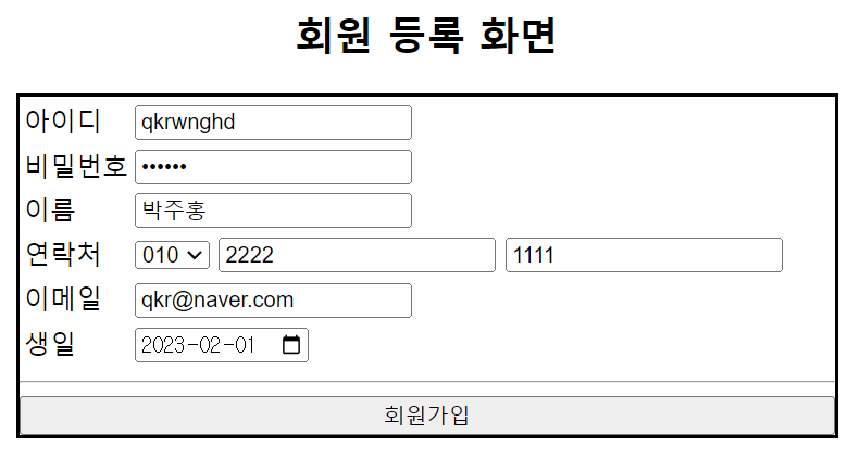앞에서 name으로 받았던 id, pw ,name , tell, birthday를 데이터로 받아올 수 있다.