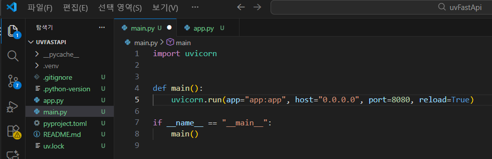 uv는 pip와 .venv를 사용하여 fastApi를 했을때와 초기 화면이 살짝 다를 수 있으나, visual에서의 문법은 똑같이 사용하면 된다.