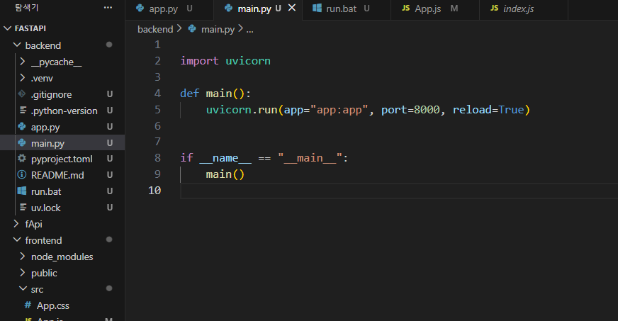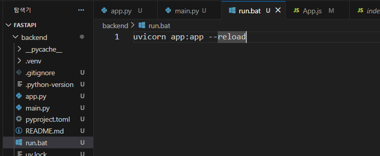 cmd 창에서 uvicron app:app --reload를 쳐도 상관없지만, 나는 단순히 run 치고 싶어서 run.bat 파일도 만들어두었다.