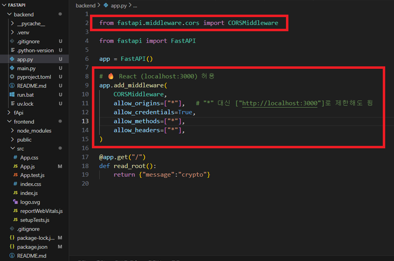 fastAPI는 포트번호 8000번을 썼고, React는 포트번호 3000번을 사용하고있다. 이때, CORS 문제가 발생될 수 있기 때문에FastAPI에서 응답이 와도 React가 response.data.~~에 접근할 수 없어 middleware.cors를 추가해줘야한다.
