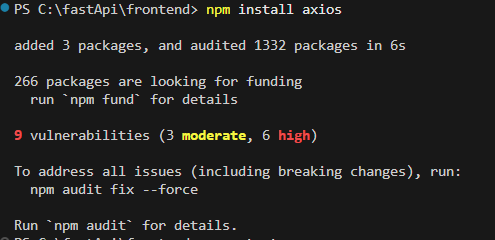 frontend 파일을 만들었으니, cmd창에서 cd frontend로 접근 한 후 axios를 설치하자.
