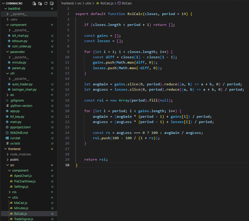 - rsiSeriesData에서는 계산된 RSI 값을 ApexChart에서 사용 가능한 { x, y } 형태의 시리즈 데이터로 변환하였다.