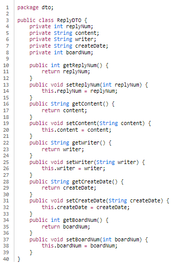 1 2 3 4 5 6 7 8 9 10 11 12 13 14 15 16 17 18 19 20 21 22 23 24 25 26 27 28 29 30 31 32 33 34 35 36 37 38 39 40 | package dto; public class ReplyDTO { private int replyNum; private String content; private String writer; private String createDate; private int boardNum; public int getReplyNum() { return replyNum; } public void setReplyNum(int replyNum) { this.replyNum = replyNum; } public String getContent() { return content; } public void setContent(String content) { this.content = content; } public String getWriter() { return writer; } public void setWriter(String writer) { this.writer = writer; } public String getCreateDate() { return createDate; } public void setCreateDate(String createDate) { this.createDate = createDate; } public int getBoardNum() { return boardNum; } public void setBoardNum(int boardNum) { this.boardNum = boardNum; } } | cs |