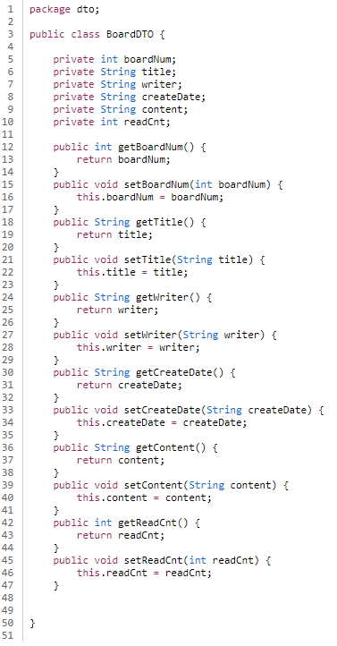 1 2 3 4 5 6 7 8 9 10 11 12 13 14 15 16 17 18 19 20 21 22 23 24 25 26 27 28 29 30 31 32 33 34 35 36 37 38 39 40 41 42 43 44 45 46 47 48 49 50 51 | package dto; public class BoardDTO { private int boardNum; private String title; private String writer; private String createDate; private String content; private int readCnt; public int getBoardNum() { return boardNum; } public void setBoardNum(int boardNum) { this.boardNum = boardNum; } public String getTitle() { return title; } public void setTitle(String title) { this.title = title; } public String getWriter() { return writer; } public void setWriter(String writer) { this.writer = writer; } public String getCreateDate() { return createDate; } public void setCreateDate(String createDate) { this.createDate = createDate; } public String getContent() { return content; } public void setContent(String content) { this.content = content; } public int getReadCnt() { return readCnt; } public void setReadCnt(int readCnt) { this.readCnt = readCnt; } } | cs |