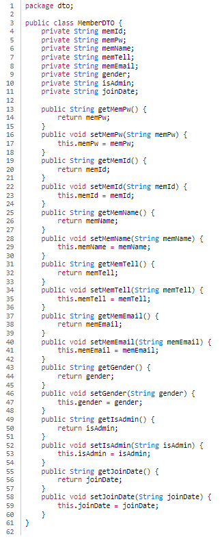 1 2 3 4 5 6 7 8 9 10 11 12 13 14 15 16 17 18 19 20 21 22 23 24 25 26 27 28 29 30 31 32 33 34 35 36 37 38 39 40 41 42 43 44 45 46 47 48 49 50 51 52 53 54 55 56 57 58 59 60 61 | package dto; public class MemberDTO { private String memId; private String memPw; private String memName; private String memTell; private String memEmail; private String gender; private String isAdmin; private String joinDate; public String getMemPw() { return memPw; } public void setMemPw(String memPw) { this.memPw = memPw; } public String getMemId() { return memId; } public void setMemId(String memId) { this.memId = memId; } public String getMemName() { return memName; } public void setMemName(String memName) { this.memName = memName; } public String getMemTell() { return memTell; } public void setMemTell(String memTell) { this.memTell = memTell; } public String getMemEmail() { return memEmail; } public void setMemEmail(String memEmail) { this.memEmail = memEmail; } public String getGender() { return gender; } public void setGender(String gender) { this.gender = gender; } public String getIsAdmin() { return isAdmin; } public void setIsAdmin(String isAdmin) { this.isAdmin = isAdmin; } public String getJoinDate() { return joinDate; } public void setJoinDate(String joinDate) { this.joinDate = joinDate; } } | cs |