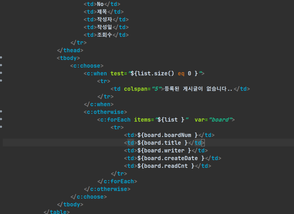 list값을 ${list}로 받아와 board로 forEach문을 돌린다.