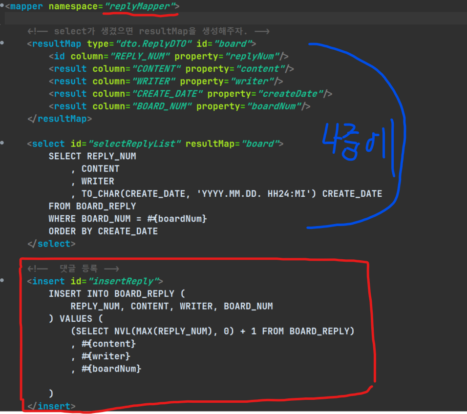 맨 위에 보이는 namespace를 replyMapper로 설정하고, insert 쿼리를 작성하자.