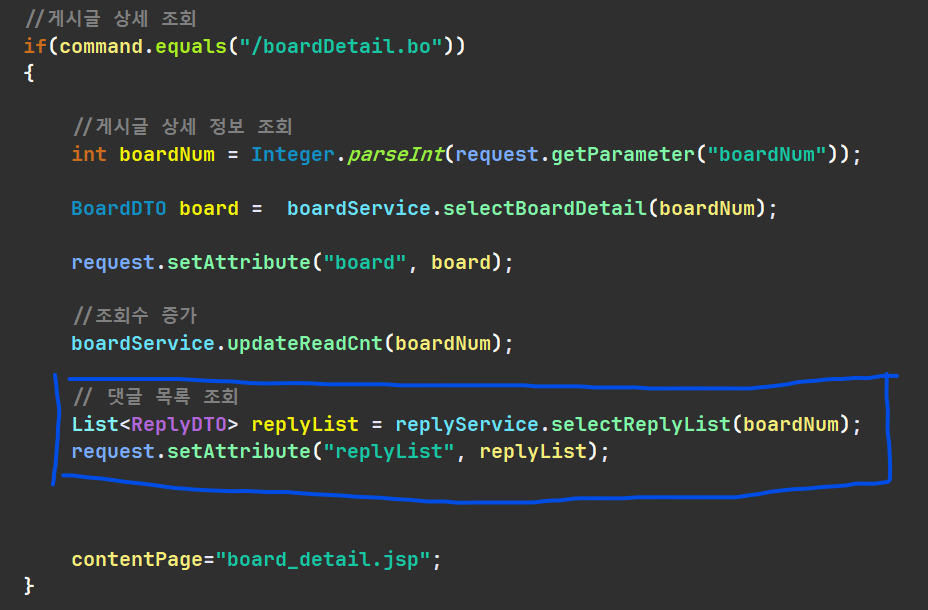 이후 쿼리문에서 생성했던 부분을 replyDTO에 넣어주며 reply라는 이름으로 boardDetail.bo에 전달한다.